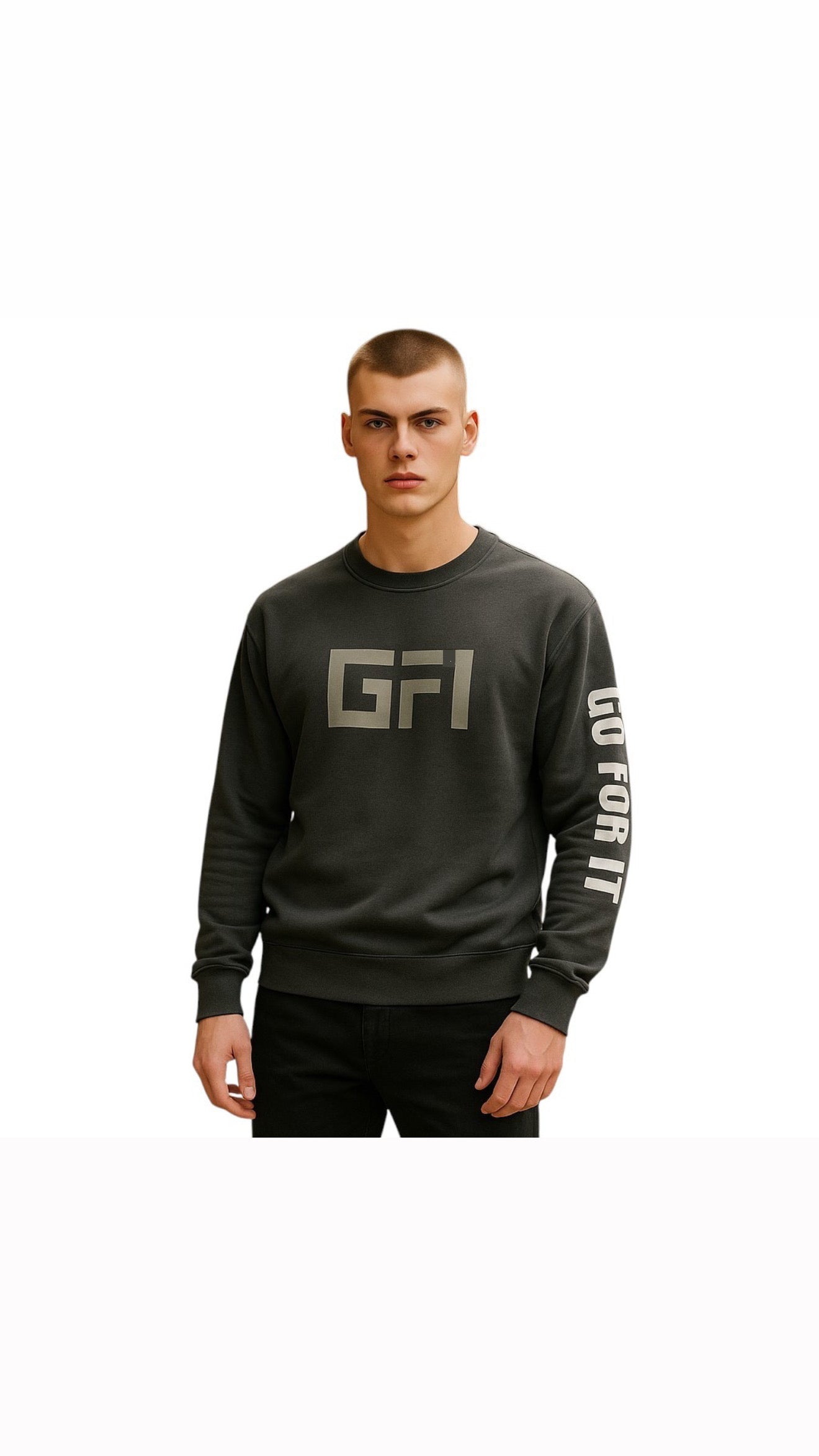 Elevate your everyday look with this bold and comfortable GFI crewneck sweater. Crafted from soft, high-quality fabric, this black pullover features a sleek matte GFI logo on the chest and an empowering “GO FOR IT” statement down the right sleeve—perfect for those who lead with confidence and purpose.