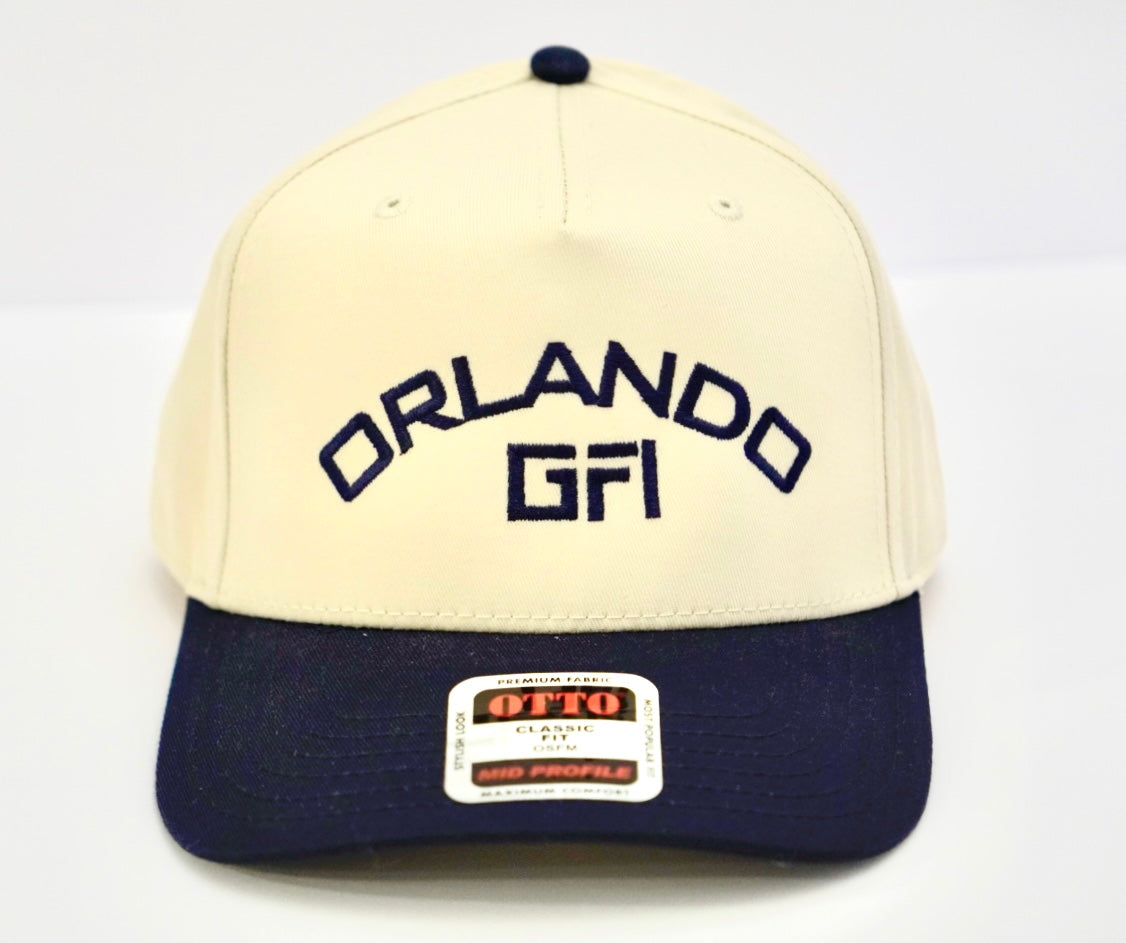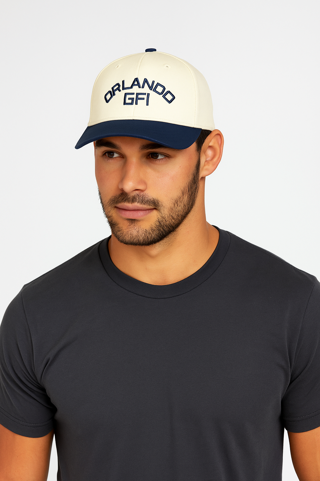 Represent your city and your hustle with the Orlando GFI Hat — a sleek, structured cap crafted by Otto, known for its premium quality and classic fit. Featuring bold "ORLANDO GFI" embroidery on the front and a navy bill for contrast, this mid-profile hat is made for everyday confidence and performance.
